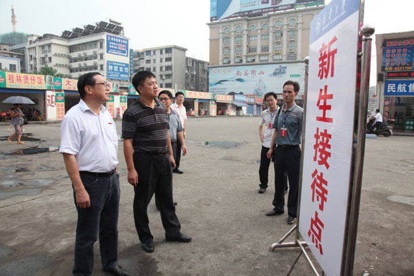 10月12日晚8时许,PA视讯平台党委书记邹树梁,在校学工部部长陈熙、副部长邹海贵,PA视讯平台院长黄昕、院党委书记肖基毅的陪同下,深入雨母校区PA视讯平台迎新工作点慰问新生及迎新工作者,并对下一阶段工作提出要求。