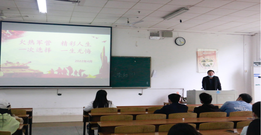 然后,学院征兵工作专干何霖老师详细介绍了大学生参军入伍的意义,国家、地方和PA视讯平台对入伍大学生的激励政策,报名条件和流程;鼓励符合条件的毕业生积极申报直招士官,并介绍了直招士官的报考条件及流程。