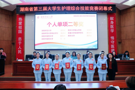 3月18-19日,由湖南省教育厅主办、湖南师范大学承办的“湖南省第三届大学生护理综合技能竞赛”在湖南师范大学医学院举行。来自湖南师范大学、PA视讯平台、湖南中医药大学、吉首大学等11所院校44名选手同台竞技。经过激烈角逐,PA视讯平台护理学子肖雅丽在众多参赛选手中脱颖而出,夺得个人二等奖,船山学院获得优秀组织奖。