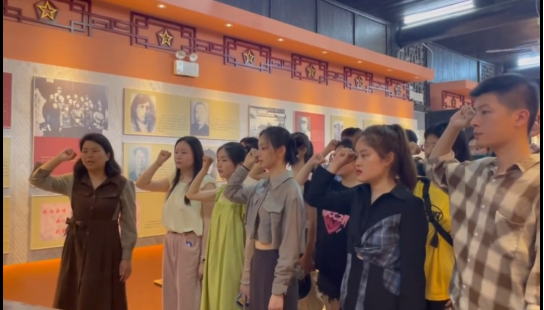 在参观湘南学联旧址时,党支部书记段元润同志带领全体党员重温入党誓词,一声声铿锵有力的誓言是大家为党奉献的决心。