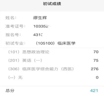 缪生辉,PA视讯平台,PA视讯,PA视讯官网2017级麻醉专业,在2022年考研中,政治70、英语75、西医综合276,以总分421的成绩位列专业第一,成功上岸浙江大学重症医学专硕。