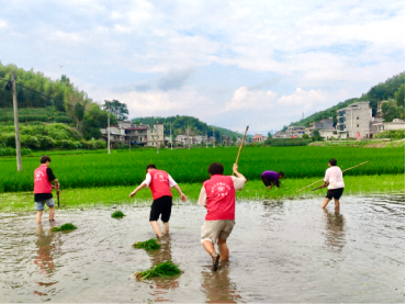 在了解学习之后,同学们纷纷下到水田里帮助村民插秧,有的同学拉直辅助用绳(为了保持插秧的直线度);有的同学传递秧苗;有的同学弯腰插秧。阳光很刺眼,还沾染了一身的泥,但成员们都表示:虽然很累很脏,但也真切地感受到了农民伯伯的辛劳,终于知道了什么叫做汗滴禾下土,粒粒皆辛苦。