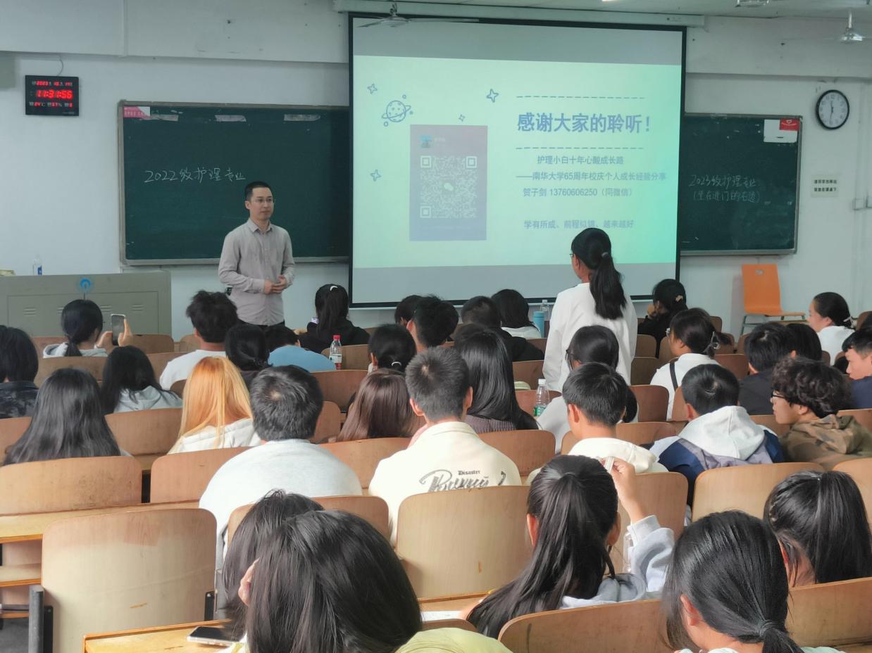 榜样力量助启航,薪火相传圆梦想。10月13日上午,PA视讯平台65周年校庆来临之际,我院邀请到2006级护理专业校友贺子剑在南华楼211教室举行校友成长成才辅导讲座,副院长廖迎春主持,学院护理相关专业同学参加。