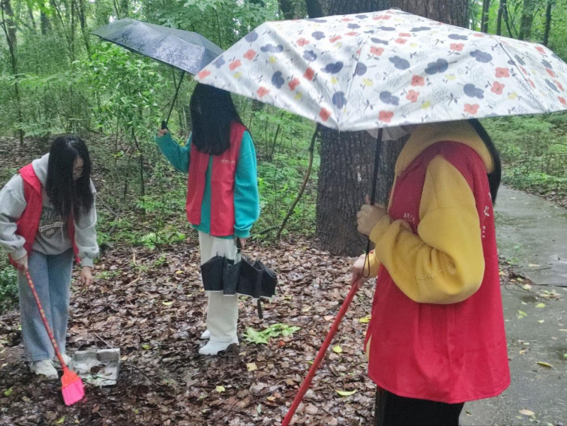5月1日,天空淅淅沥沥下着小雨,即使在打扫过程中被雨淋湿,鞋底挂满泥土,但这丝毫不影响党员同学的劳动热情。大家分工明确,相互合作,不放过任何一个卫生死角。