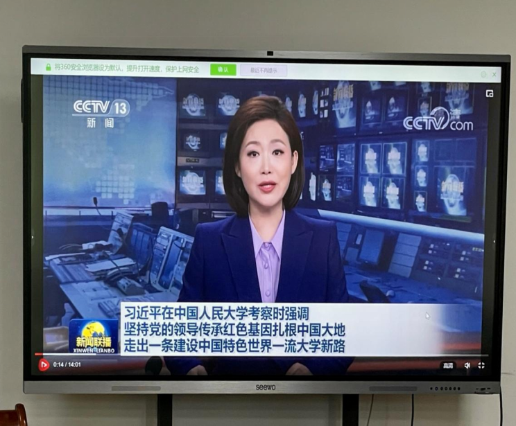 会上,观看了习近平总书记在中国人民大学考察时的新闻视频。在“五四”青年节到来之际,中共中央总书记、国家主席、中央军委主席习近平4月25日上午来到中国人民大学考察调研。习近平代表党中央,向全国各族青年致以节日的祝贺,向中国人民大学全体师生员工、向全国广大教育工作者和青年工作者致以诚挚的问候。习近平希望全国广大青年牢记党的教诲,立志民族复兴,不负韶华,不负时代,不负人民,在青春的赛道上奋力奔跑,争取跑出当代青年的最好成绩。